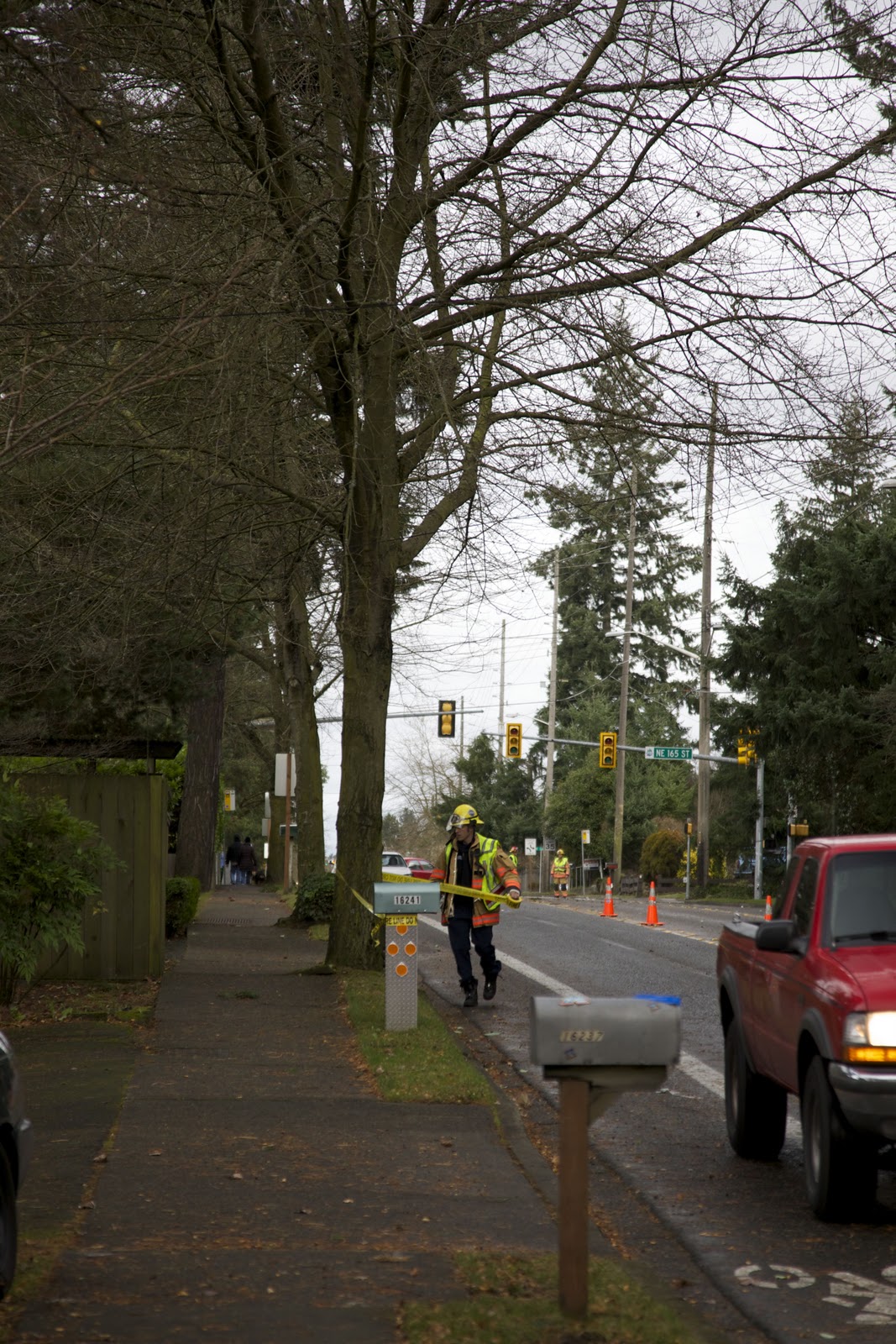 | Police block the lane so crews can work. 15th NE between NE 163rd and 165th. Photo by Steven H. Robinson |